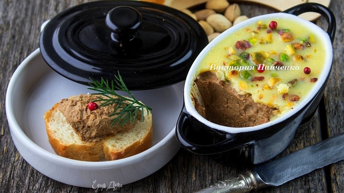 - Шаг 3Разложить паштет по формам. Оставшееся масло растопить, залить им паштет сверху тонким слоем, посыпать рубленными фисташками и поставить в холодильник на 1-2 часа. Подавать на гренках или хлебцах. Хранить в холодильнике.