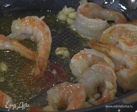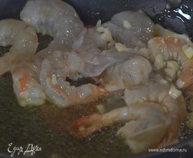 Разогреть в сковороде оливковое масло, выложить креветки, чеснок и слегка обжарить, чтобы креветки стали розовыми.