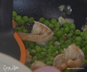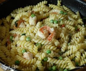 Паста с креветками, зеленым горошком и базиликом