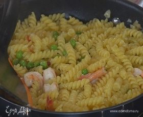 Выложить к креветкам с горошком готовые макароны, влить 2 ст. ложки воды, в которой они варились, перемешать.