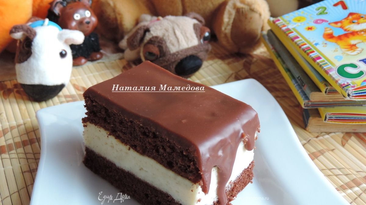 В оригинале пирожное называлось "Киндер милк слайс". С претензией на то, что это домашний вариант популярного детского пирожного. Не могу сказать, насколько он похож на оригинал (никогда даже в голову не приходило покупать его детям