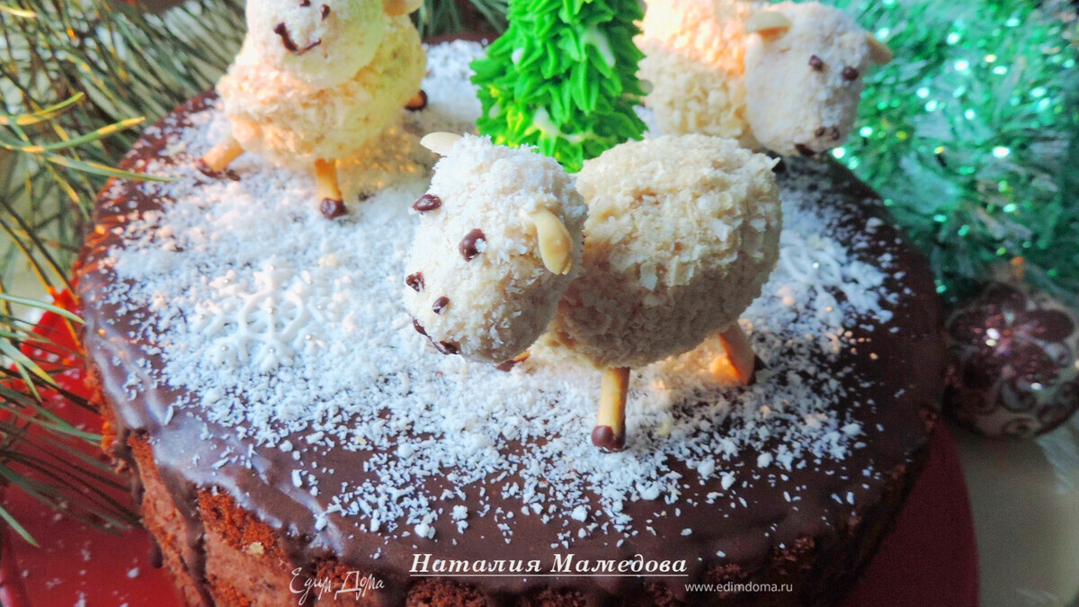 Украшаем торт по желанию. Я посыпала его сверху кокосовой стружкой, имитируя снег. Поставила сверху овечек, как их сделать смотрим здесь ссылка на рецепт и айсинговую елочку, МК смотрим здесь ссылка на рецепт
