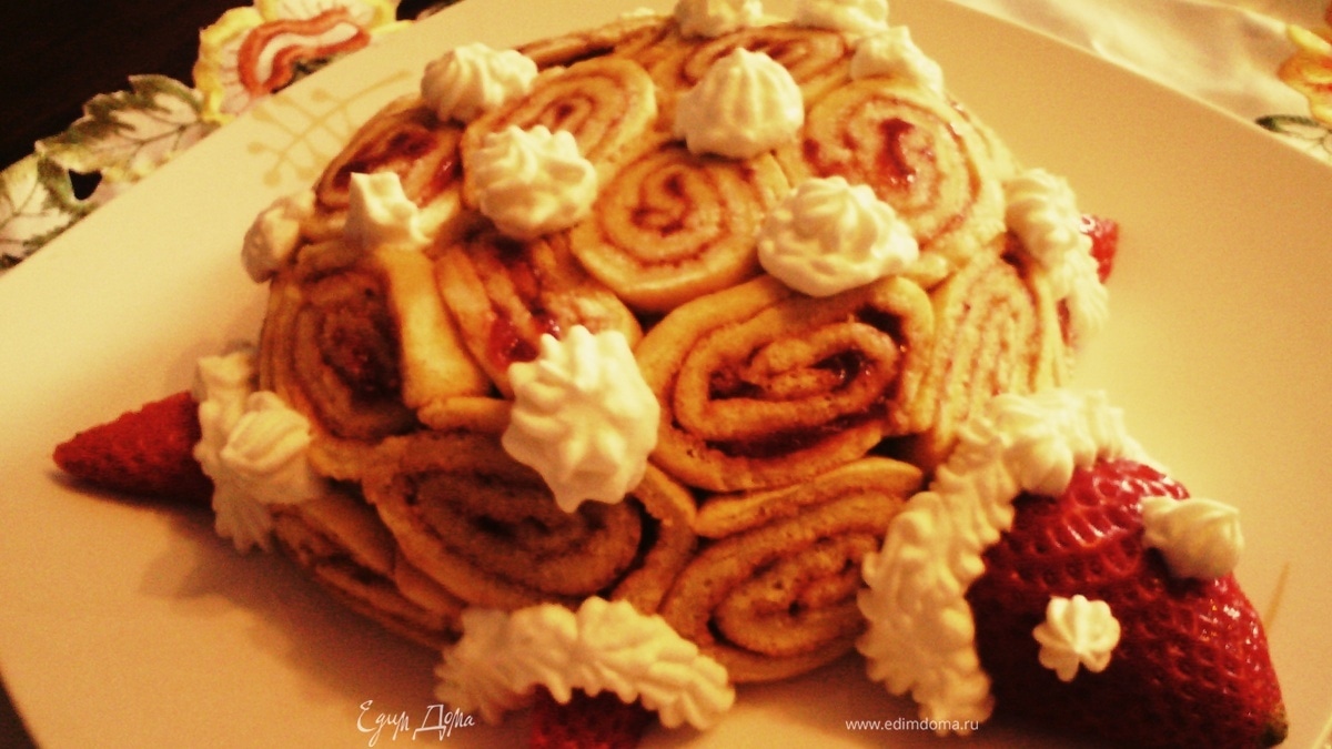 Бисквит: Взбить желтки и сахар до полного растворения сахара. Добавить муку. Взбить яичные белки до жесткого пика и добавить потихоньку в указанную выше смесь. Выложите тесто на противень, застеленной пекарской бумагой. Выпекать в течение десяти минут при 180 °. Переложить корж осторожно на влажное полотенце отделить от пекарской бумаги. Нанести варенье, свернуть плотно в рулет и поставить в холодильник, по крайней мере, на 30 мин (Это облегчает резку)