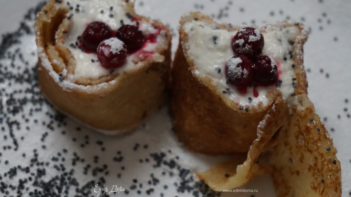 Как вариант, свернуть блинчик с творожной массой мешочком и закрепить шпажкой. Приятного аппетита!