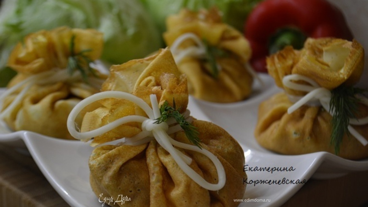 Собрать края блинчика и завязать таким образом, чтобы получился мешочек. Завязать сыром. Можно подавать.