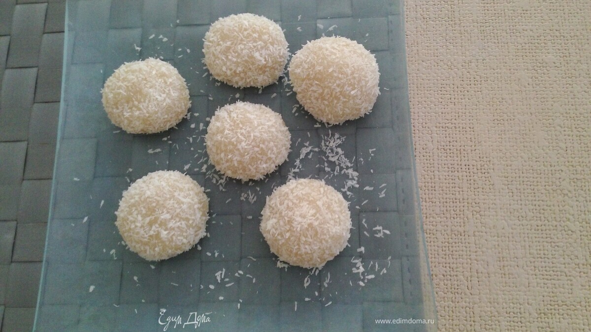 После того, как вы вынули ваши шарики, их сразу нужно обвалять в оставшейся кокосовой стружке.