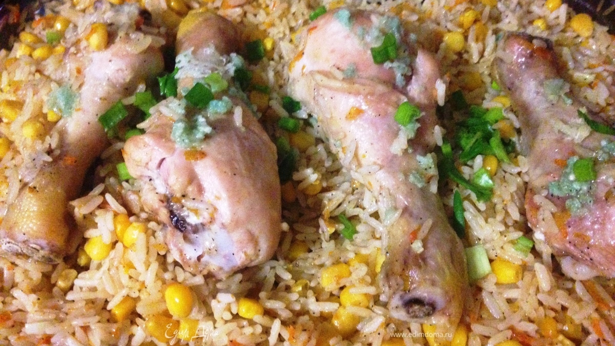 Форму для запекания смазать растительным маслом, всыпать сухой рис, отцеженную от жидкости кукурузу, зажарку из моркови и чеснока. Посолить, поперчить, хорошо перемешать. - Шаг 2