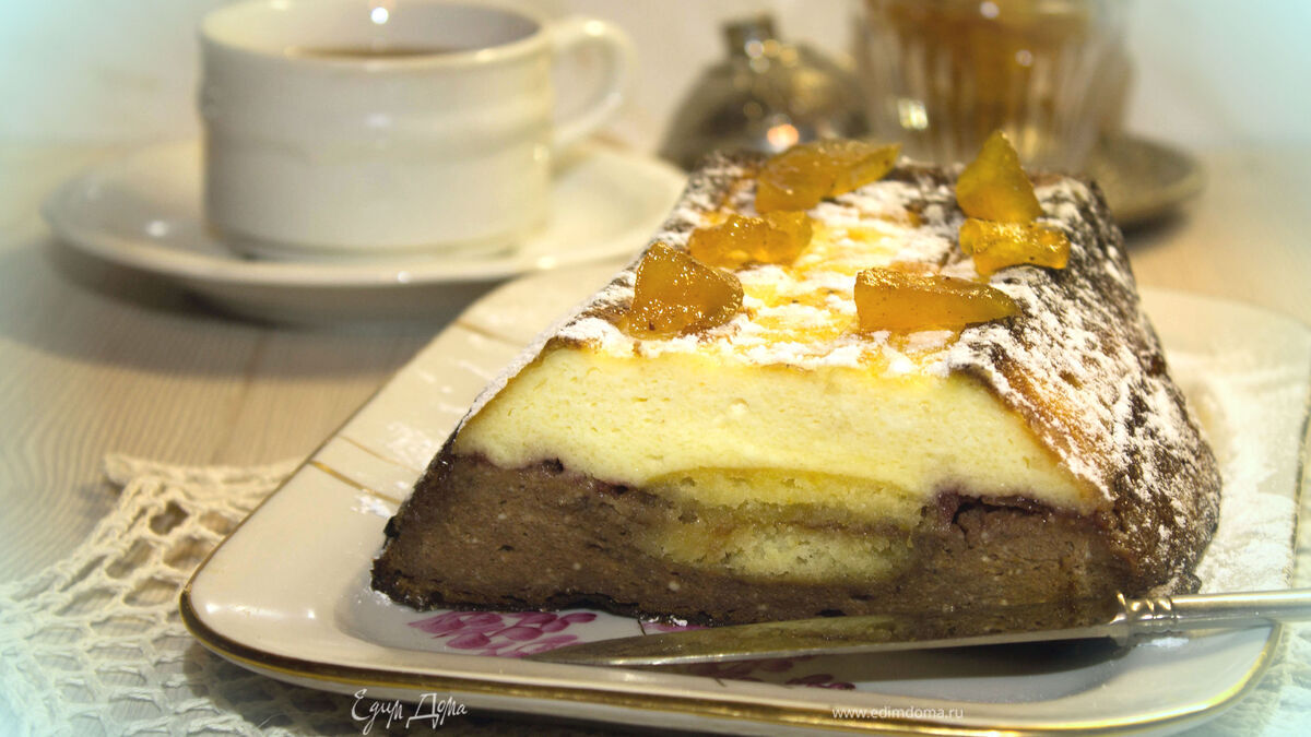 Сверху выложите слой шоколадной массы и поставьте в духовку на 45-50 минут при 180 градусах. Если верх начнет сильно румяниться, накройте его листочком фольги. Готовый сырник должен хорошо остыть и постоять несколько часов в холодном месте. Подавайте сырник с гарниром из джема. Приятного аппетита!