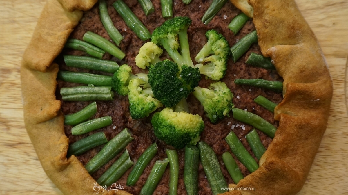 Сверху выложить замороженную брокколи и стручковую фасоль. Перед выпечкой галету полить растительным маслом.