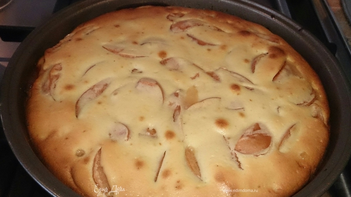 Яблоки моим немного очищаем от кожуры и сердцевины и режем тонкими дольками. В готовое тесто выкладываем яблоки и аккуратно перемешиваем, затем выкладываем в смазанную маслом форму. Ставим выпекать заранее подогретую духовку 180-200 градусов на 20 минут, пока пирог не подрумяниться.