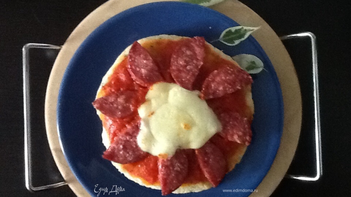 Смазываем основу томатным соусом, выкладываем колбаску в виде лепестков цветка, в серединку сыр, у меня домашний сулугуни. Духовку предварительно разогреем до максимума, ставим под гриль и через 5 минут пицца готова!