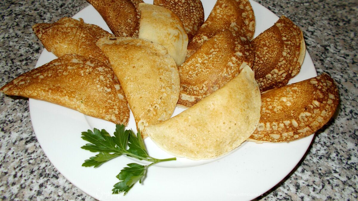 Однажды увидела передачу про иранскую кухню. И была удивлена, сколько у них там разных блинчиков в форме пирожков, вареников и треугольничков. Начинки в основном сладкие и приторно сладкие, и все это полито медом и усыпано орешками. Рецепт оказался очень прост, удивило то, что блинчик выпекают только с одной стороны, такого в моей блинной практике еще не встречалось. Я уже перепробовала эти блинчики с разными начинками и сладкими, и не сладкими. Дочка носила их на Масленицу в школу, и к ней стояла очередь за диковинными треугольниками с вареной сгущенкой.