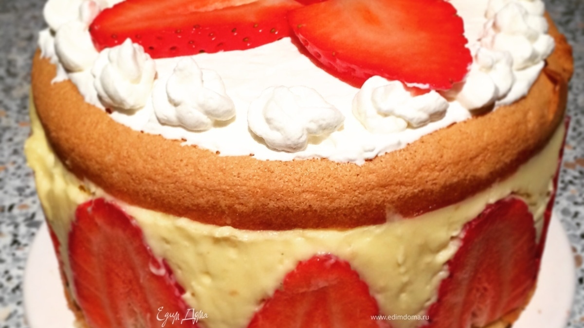 - Шаг 3Теперь можно собирать торт. Бисквит разрезать на 2 равные части, каждую немного смазать жидким клубничным джемом. Положить одну часть бисквита в разъемную форму, по кругу выложить половинки клубничек. Оставшуюся клубнику нарезать небольшими кубиками.Выложить 1/3 крема, затем клубнику по всей поверхности, опять крем, опять клубнику и снова крем. Сверху накрыть второй половинкой бисквита и убрать в холодильник минимум на 5 часов, а лучше на ночь. Перед подачей украсить торт взбитыми сливками и несколькими ягодками клубники по желанию.