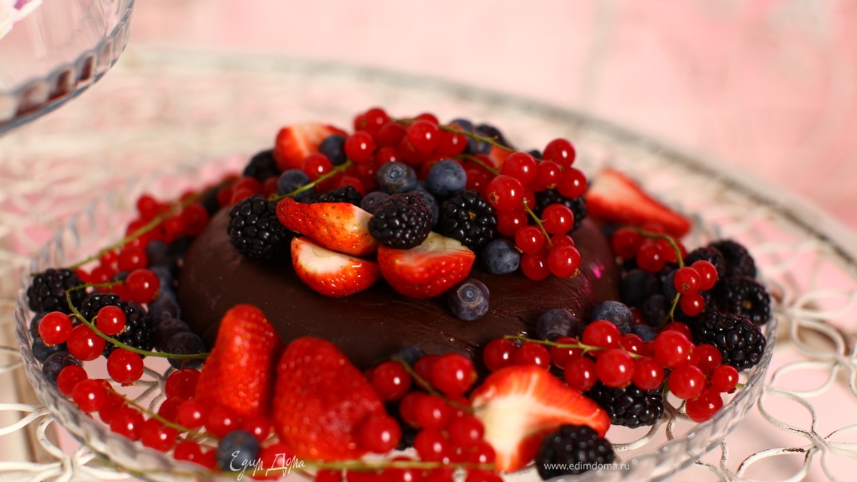 - Шаг 2Возьмите разъемную форму (диаметром 20 см и предварительно выстелите ее дно бумагой для выпечки), вылейте в форму шоколадную массу, украсьте тортик свежими ягодами и поставьте в холодильник на пару часов.