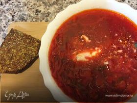 В тарелку я сначала кладу мелко порезанную половинку заранее сваренного яйца (вторую половинку яйца оставляю для украшения), наливаю борщ и кладу сметану. Если с горбушкой черного хлеба, с одной стороны смазанной чесноком, а с другой присыпанной крупной солью. Нам все понравилось: вкусно, полезно и витаминно.