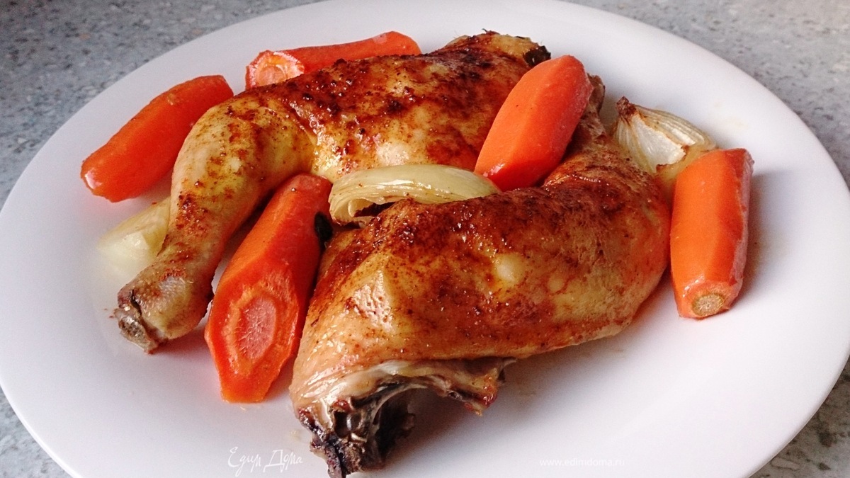 Куриные ножки промыть, высушить бумажным полотенцем. Натереть чесноком. Посолить, поперчить. Обсыпать со всех сторон карри и паприкой и натереть. Выложить в смазанную сливочным маслом форму для запекания (у меня 2). Сбрызнуть оливковым маслом. Лук почистить и нарезать крупными дольками, морковь крупными кусками. Выложить в форму к курице. Также добавить оставшийся чеснок. Нащипать листья базилика и также выложить в форму. - Шаг 1