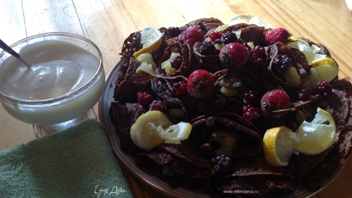 Поливаем 1/4 частью лимонного сока и украшаем наш букет лимонными кольцами, ежевикой и клубникой. Подаем наш букет из шоколадно-блинных роз с творожным йогуртом.