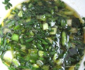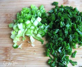 Приготовить соус. Мелко порубить зеленый лук и стебли шнитт-лука.