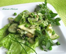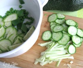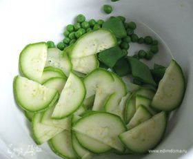 Кабачок нарезать тонкими дольками (молодой кабачок не чистить от шкурки). Смешать с горошком и фасолью в стручках.