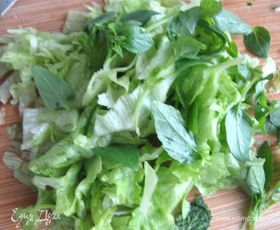 Айсберг, латук и базилик ( 1- 2 небольшие веточки) порезать или порвать руками.