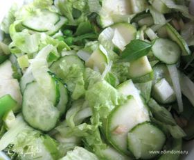 Яблоко и авокадо нарезать кубиками, сбрызнуть соком лайма. Смешать с овощами и миксом из листьев салата и базилика. Вместо базилика можно использовать руколу.