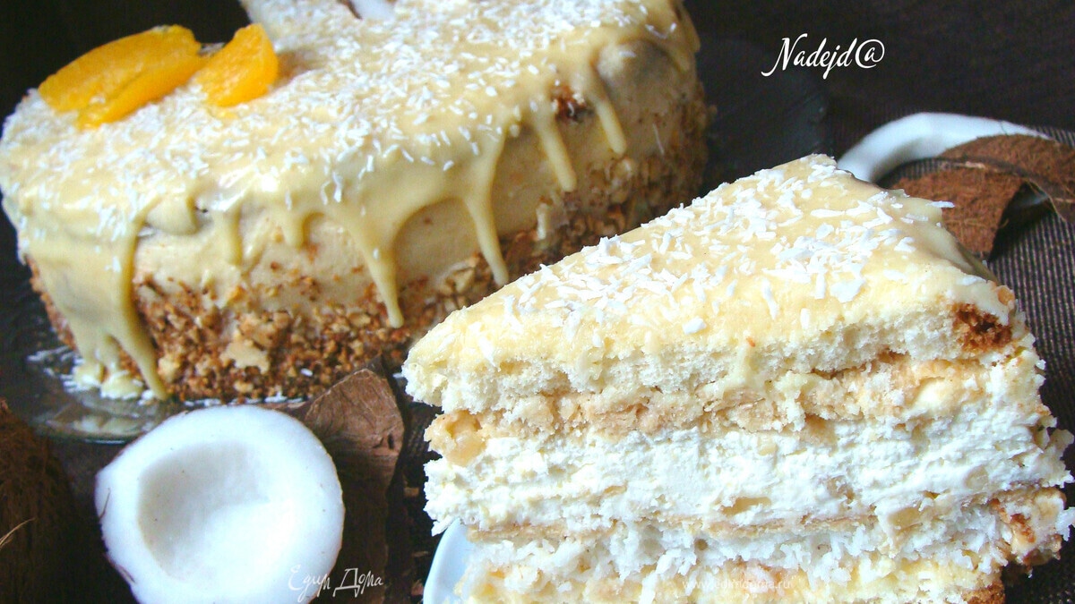Испечем кокосовый корж. Белки отделим от желтков. Желтки пригодятся для пудингового крема. Белки взбить с сахаром до устойчивых пик. Стружку перемешать с крахмалом. Аккуратно вмешать взбитые белки. Вылить тесто в форму, застеленную пергаментом. Выпекать при температуре 180 гр. в разогретой заранее духовке около 15-20 минут. - Шаг 2