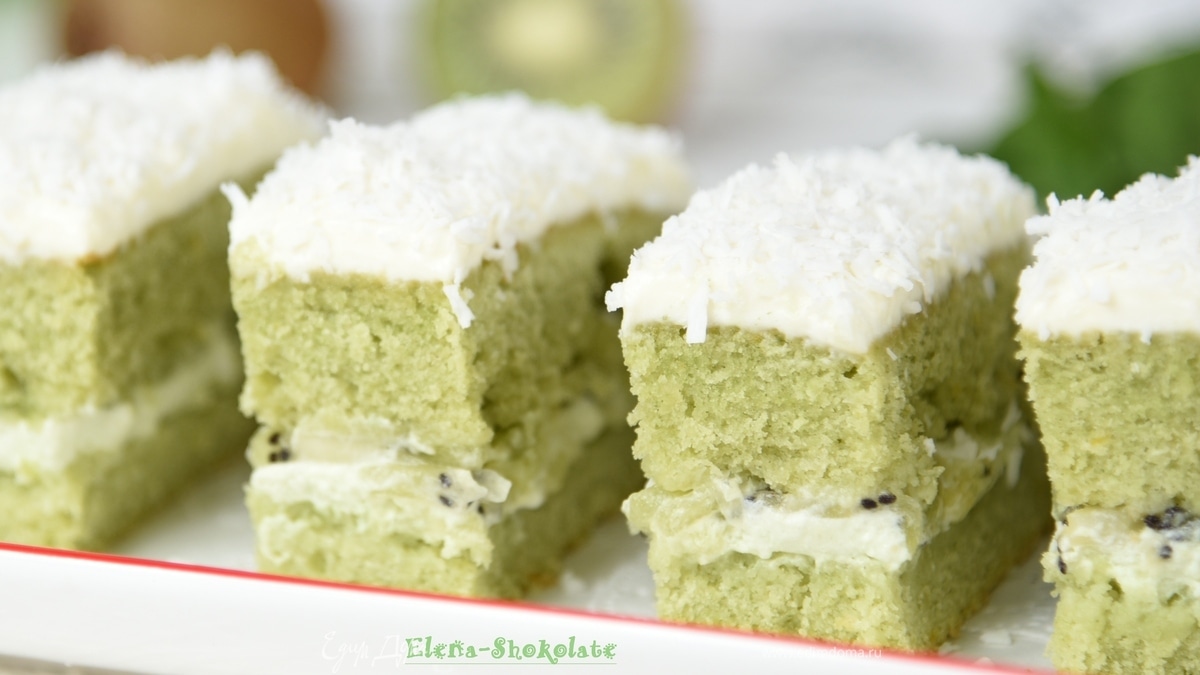 Именно такое впечатление у меня от этих пирожных – зеленая трава под снежной шубкой, снежинками. Освежающие лимонные коржи и сметанный крем - цвета молодой зелени - с прослойкой из киви укрыты белоснежным кремом с кокосовой стружкой, похожей на снежинки. Очень легкое и приятное пирожное!