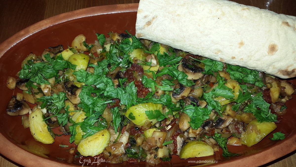 Брюссельская капуста с каштанами, грибами и вялеными томатами