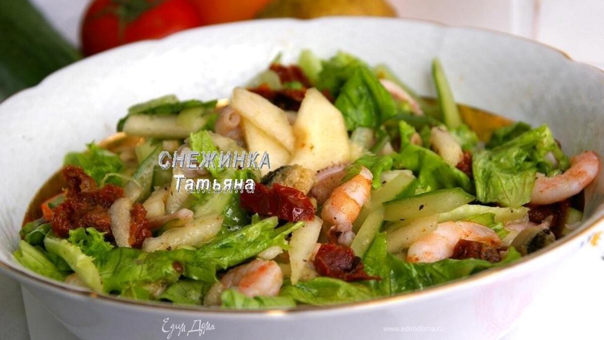 Салат из морепродуктов с грушей и вялеными томатами