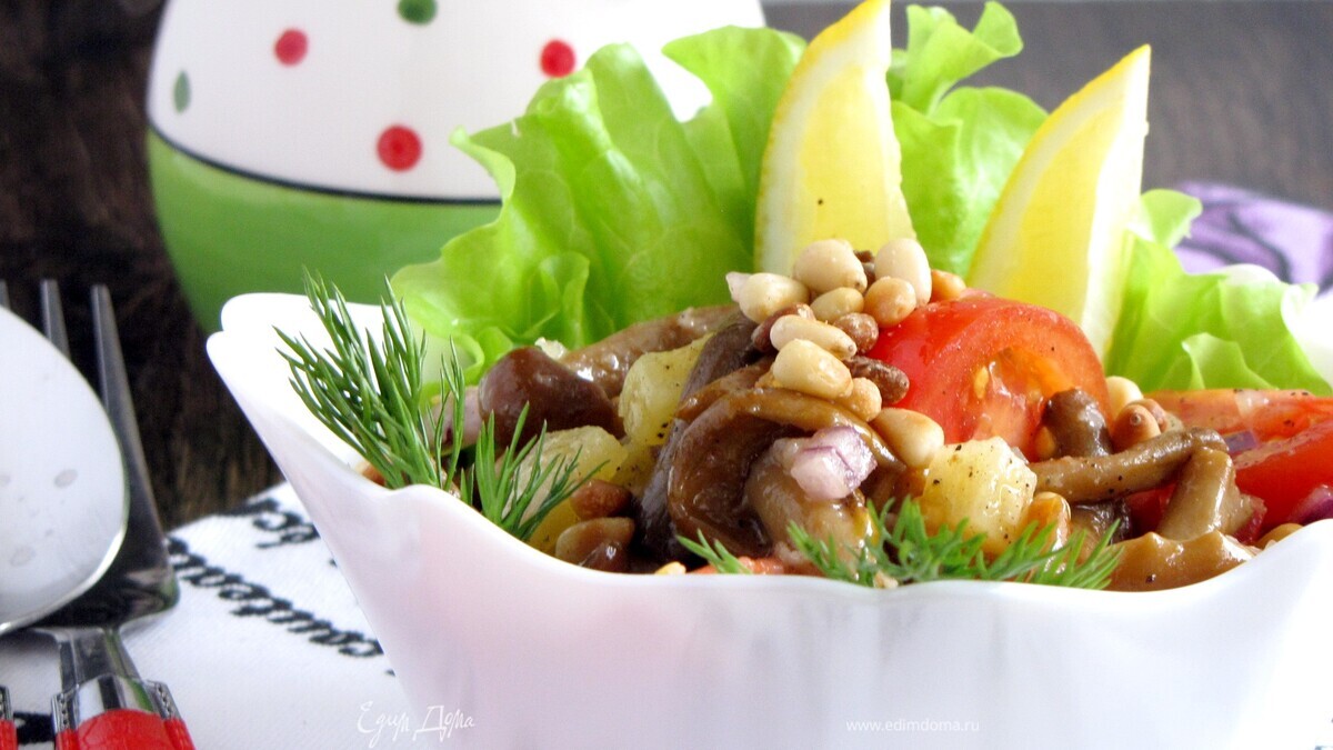 Салат с опятами, овощами и кедровыми орешками