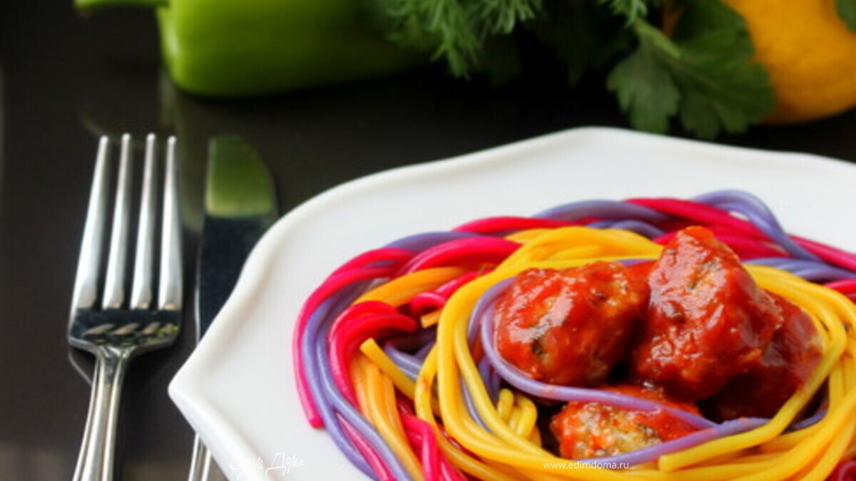 Разноцветную пасту разложить по тарелкам и в серединку положить фрикадельки в соусе. Приятного аппетита!