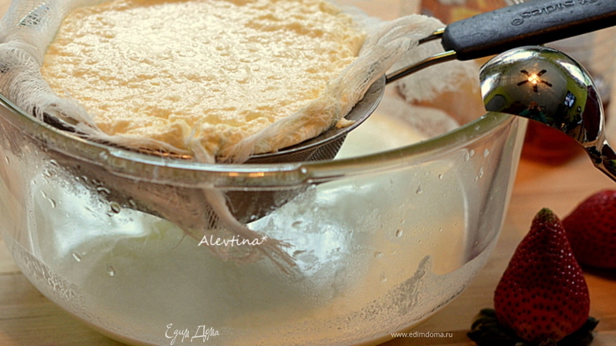 На емкость поставим ситечко и марлю, складываем ее вдвое. Перелить аккуратно продукт и дать стечь жидкости, оставив при комнатной температуре примерно 20-30 мин. - Шаг 3