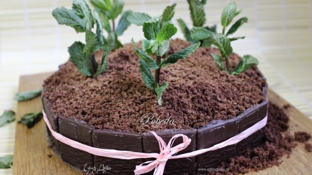 Верх засыпаем бисквитной крошкой и "сажаем" в нашу импровизированную землю веточки мяты. До подачи ставим торт в холодильник. Если дегустация будет только на следующий день, то мятой соответственно декорируем перед подачей. - Шаг 11