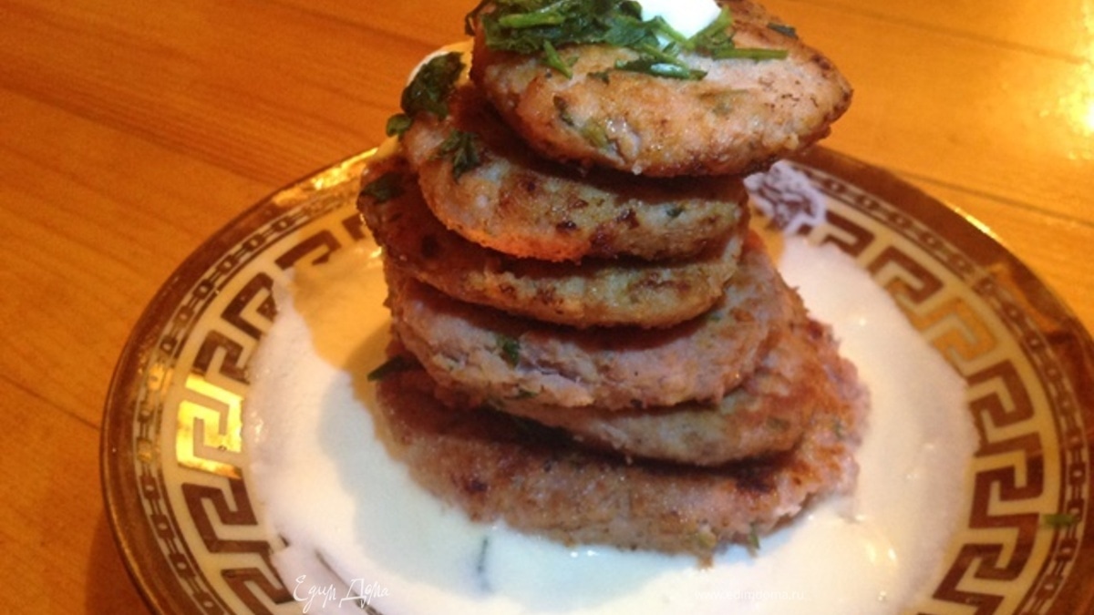 - Шаг 4Снимаем с огня, выкладываем на бумажную салфетку, чтобы стек весь жир. Выкладываем на тарелку, подавая, украшаем листьями петрушки и сметаной. Приятного аппетита!