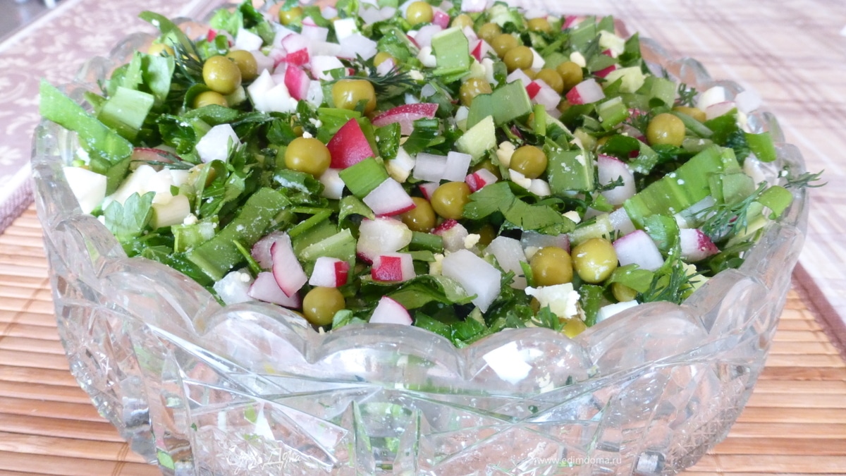 Этот зеленый салат я всегда готовлю в начале весны, как только появляется листовая черемша. Все очень просто и не хлопотно. Овощи и зелень помыть, обсушить. Яйца отварить, зеленый горошек извлечь из банки и слить лишнюю жидкость. Вот такой у меня весенний набор получился. - Шаг 1