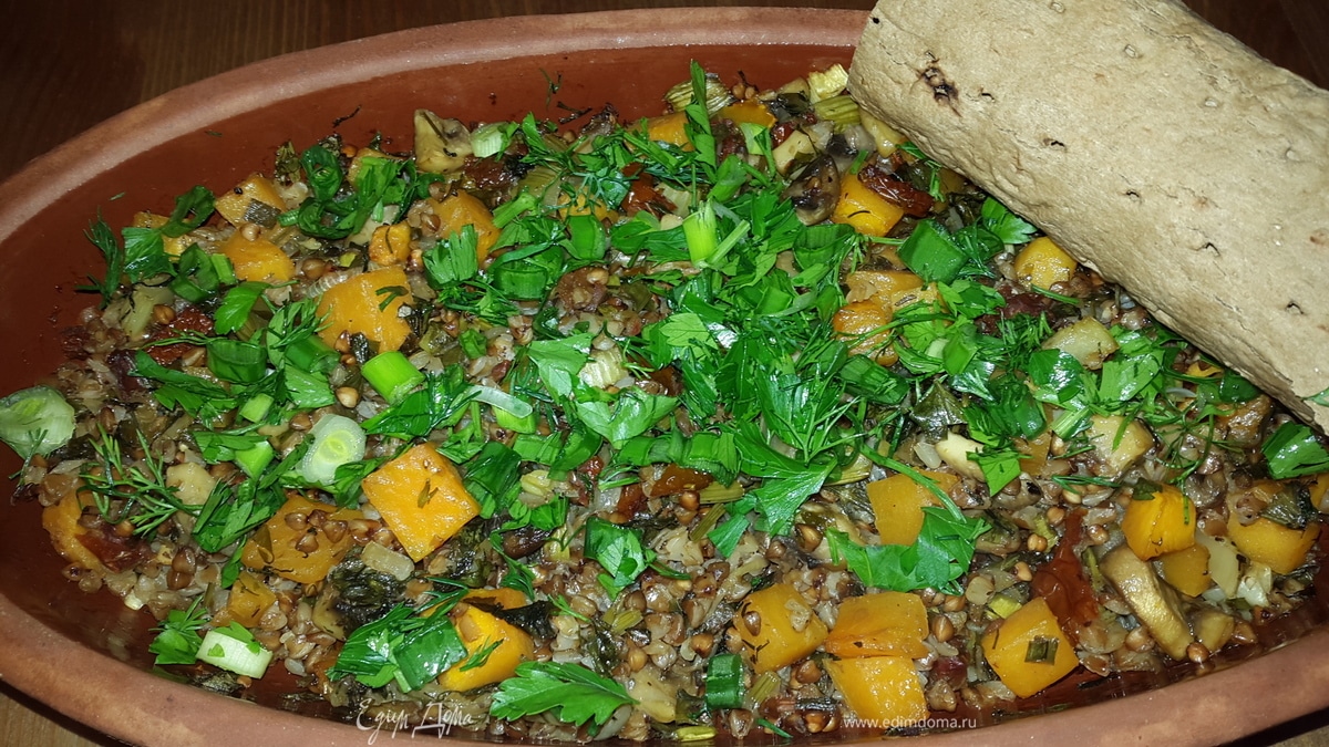 Гречка, томленая с тыквой, грибами, сельдереем и вялеными томатами