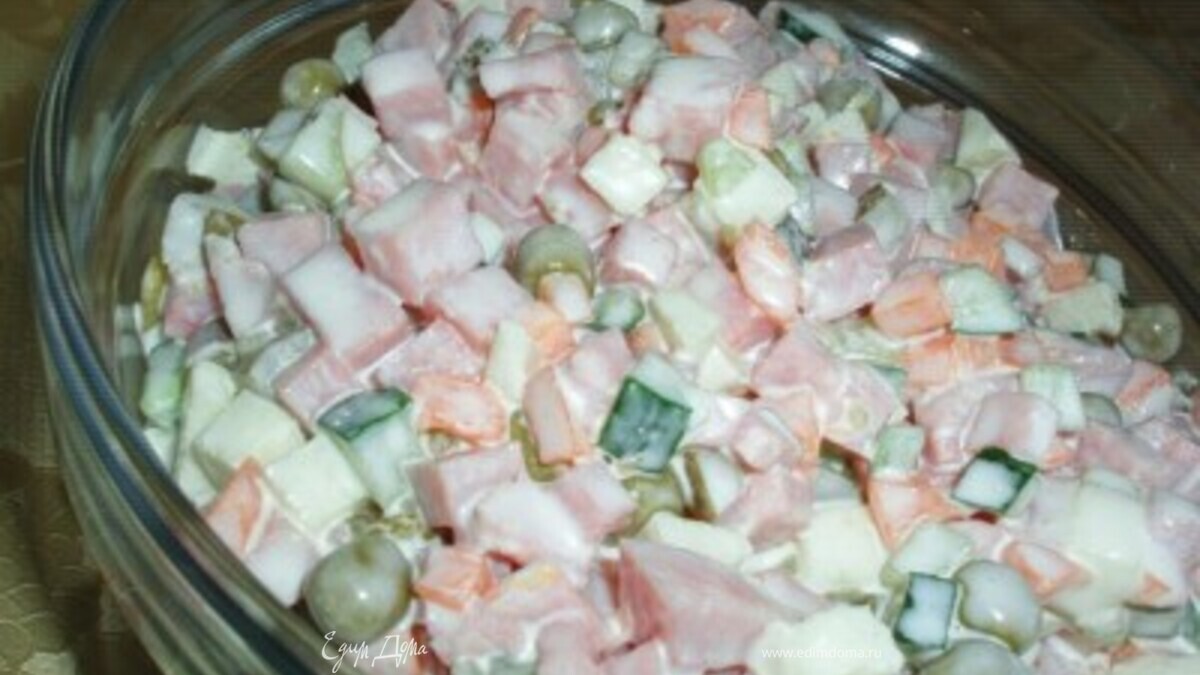 - Шаг 1Все компоненты (я кладу продукты "на глаз", на 500 г ветчины, 1 среднее яблоко, 3 некрупные моркови, 3 средних маринованных огурчика, 1/2 длинного свежего огурца, маленькая банка горошка) порезать кубиками. Заправить майонезом или смесью майонеза и сметаны.