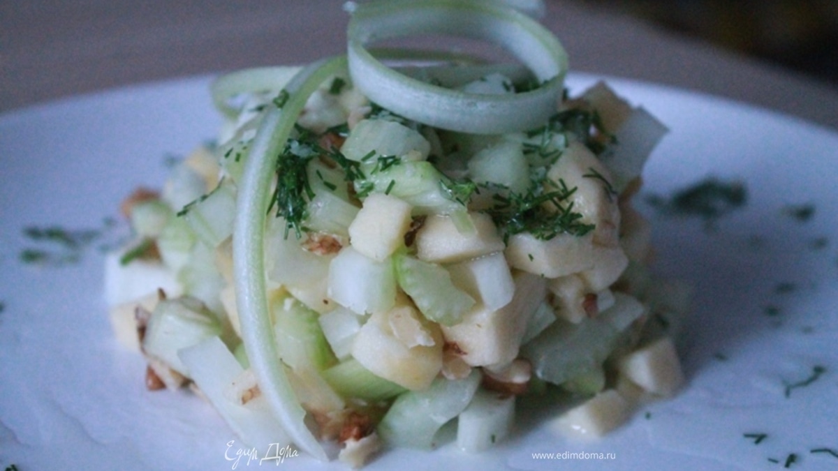 Свежесть салату придают сельдерей и зеленое яблоко, а благодаря грецким орехам этот легкий и хрустящий салат становится вполне сытным.