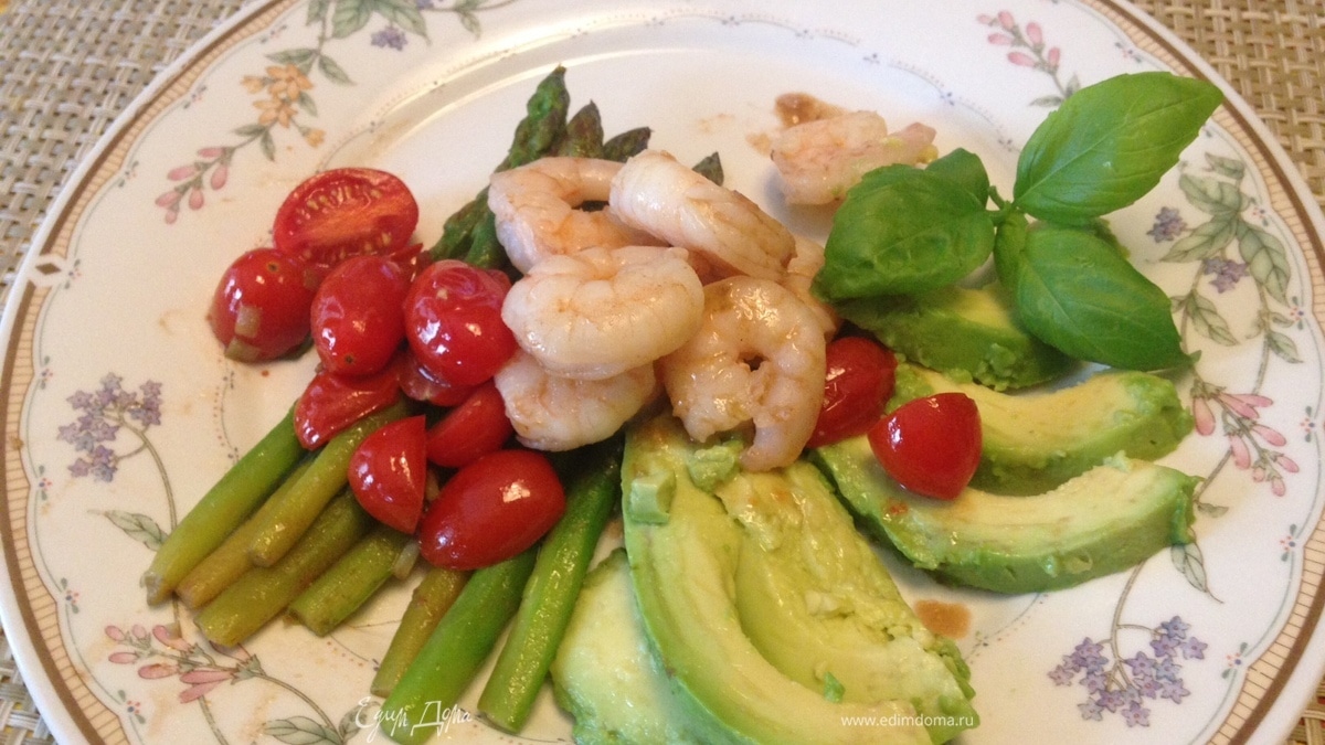 Креветки помыть и обсушить. Помидоры нарезать пополам. В оригинальном рецепте используется стручковый горошек, но я его заменила на спаржу-больше нравится:) Спаржу вымыть, обломать нижнюю часть стебля и очистить овощечисткой жёсткие концы. Бланшировать в кипящей воде, затем откинуть на дуршлаг и обдать холодной водой. - Шаг 1