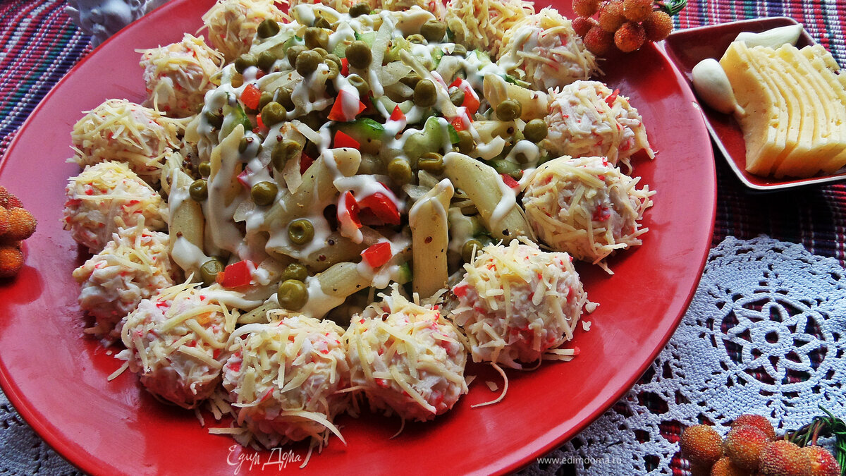 Выкладываем салат горкой, выдавим на него "сеточку" из майонеза, по краю пристраиваем шарики.