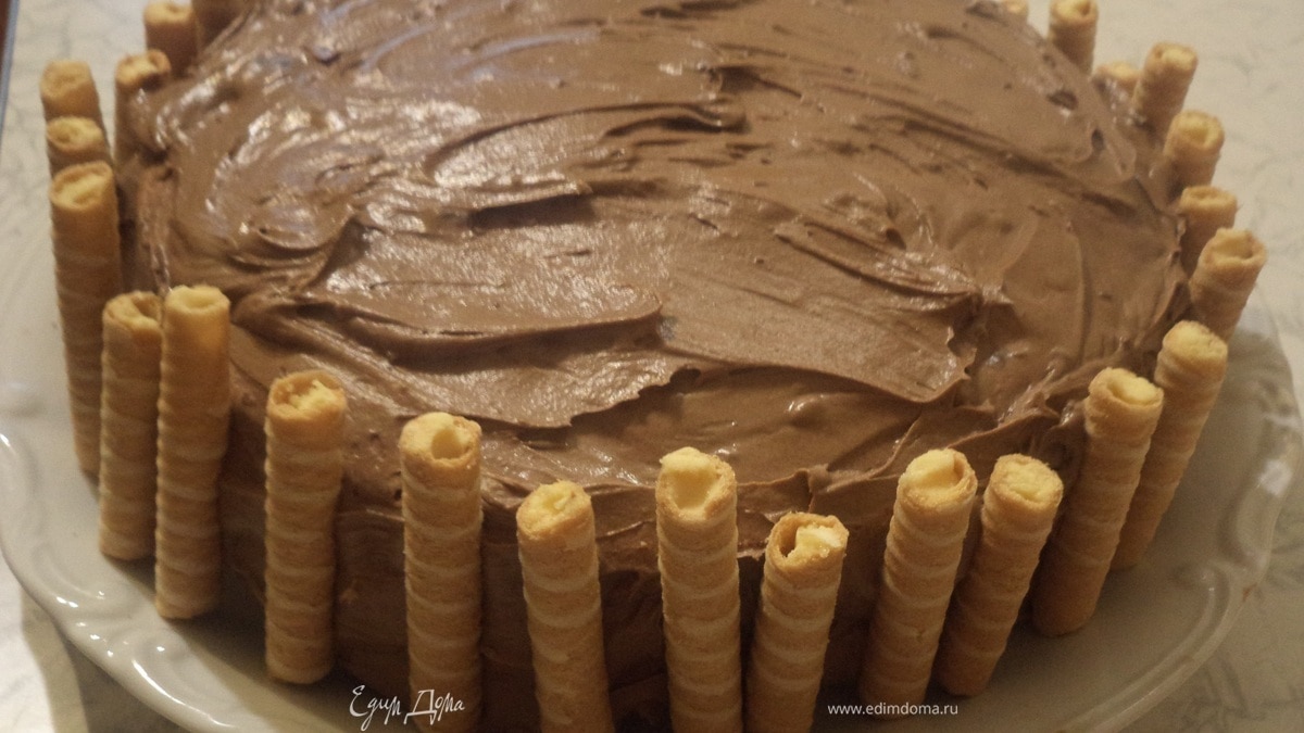Верх торта посыпать порошком какао. Вафельно-ореховые рулетики разломать пополам и украсить ими бока торта.