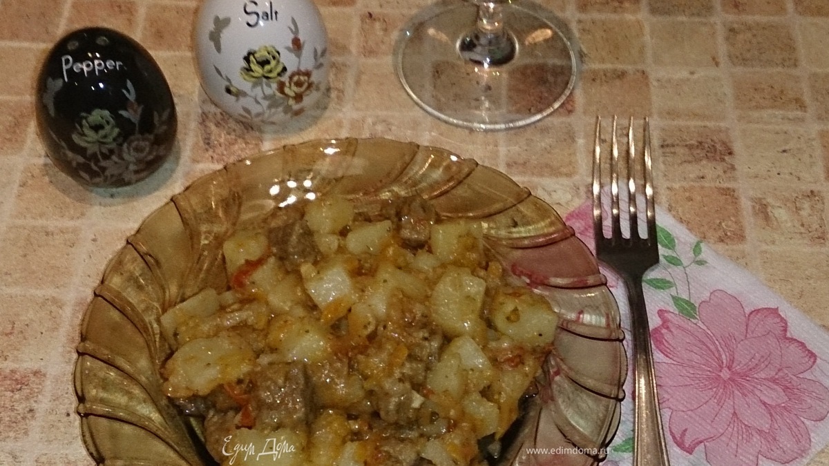 - Шаг 2Картофель чистим, промываем и шинкуем средними кубиками. Кладем картофель. Ставим в духовку и готовим на среднем огне 1 час 20 минут.