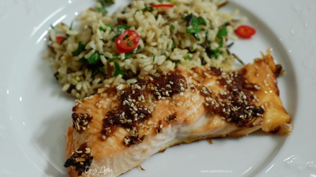 Семгу покупайте одним куском и, главное, не передержите ее в духовке, иначе она будет сухой и неинтересной. Готовую рыбу лучше сразу переложить на блюдо — на противне она будет продолжать готовиться. В рис при подаче можно добавить соевый соус.