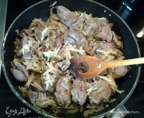 К печени добавить очищенное и натёртое на крупной тёрке яблоко. Перемешать и тушить 3 - 4 минуты.
