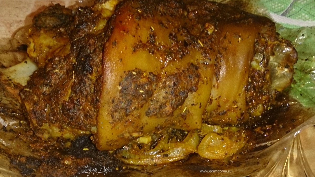 Когда рулька отварилась, достаем ее и даем немного остыть. Делаем пару проколов ножом и натираем ее этой смесью тщательно. Засовываем ее в рукав для запекания, немного подливаем бульон 2 ст. л. и ставим в разогретую духовку до 200 градусов на 1 час.