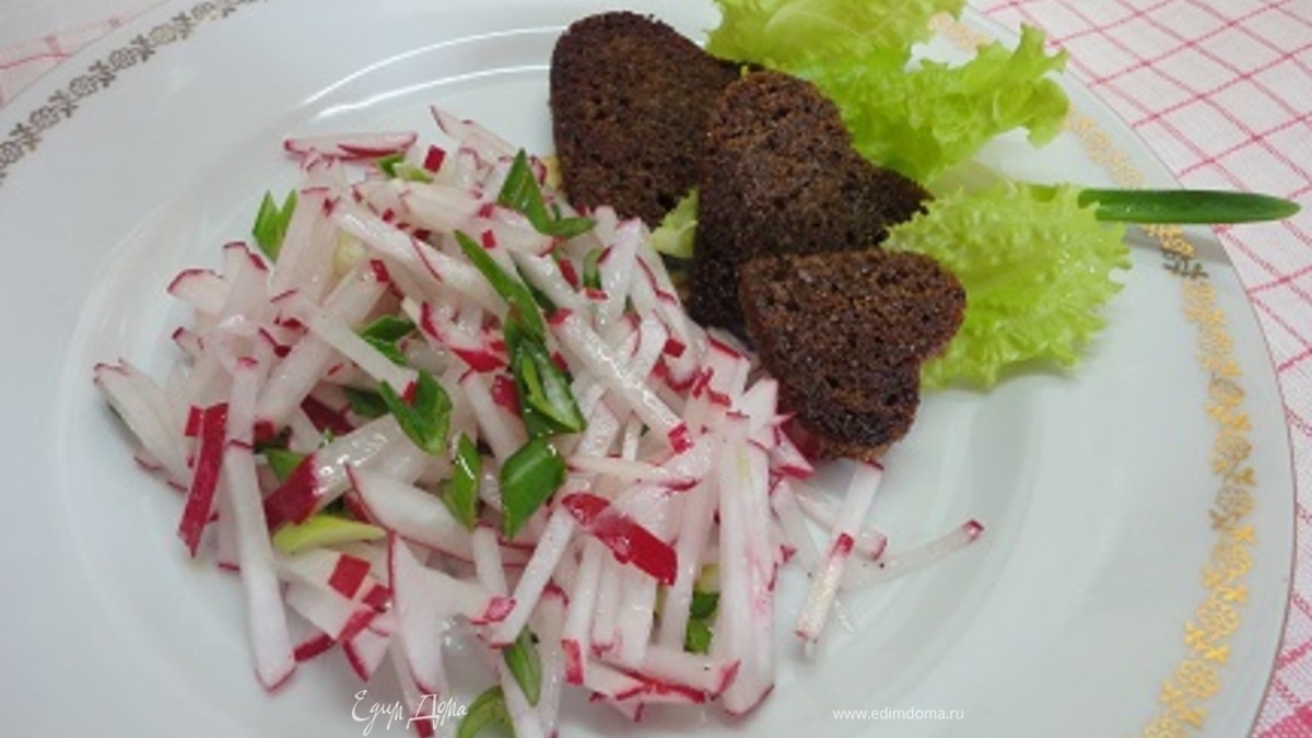 Простой, но вкусный рецепт из книги "Русская Кухня". В оригинале - это салат с редькой. Но с редисом он выглядит аппетитнее и более весенним. А жареные соленые гренки из ржаного хлеба придают богатый вкус этому простому салату.