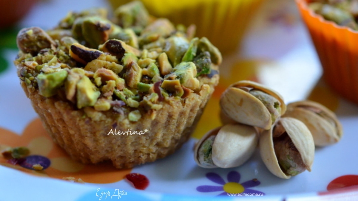 Тесто выложить в форму или в порционные формочки, я брала ложкой для мороженого— 1 ложка на 1 форму. Хватает ровно на 9 шт. Сверху распределить фисташки и поставить в разогретую духовку на 30–40 мин. Время рассчитывайте в зависимости от величины формы. - Шаг 5