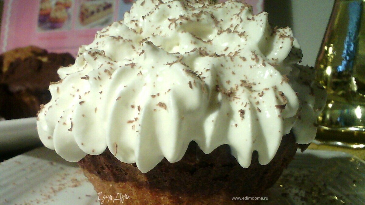 Для шантий: взбить 200 мл сливок, 2 пакетика ванильного сахара и 1 пакетик загустителя для шантий. Украсить капкейк. Посыпать тертым шоколадом.