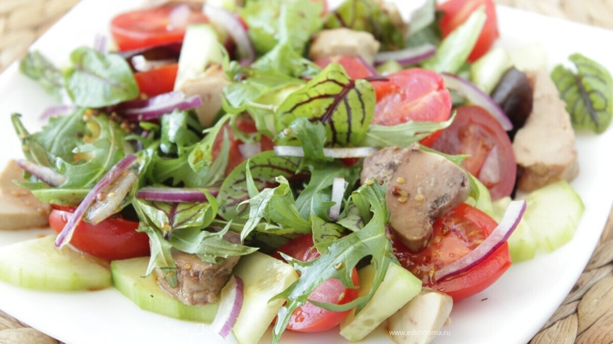 Вкусный салатик! На мой взгляд, нежная печень хорошо сочетается с овощами и руколой, а интересная заправка придает салату пикантности. Можно просто заправить салат хорошим оливковым маслом!