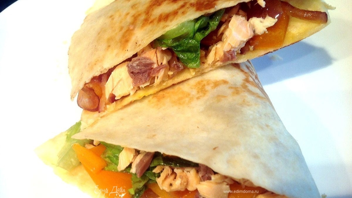 На половину лепешки выложите листья салата, лук с болгарским перцем, лосось (ломтиками) и натертый сыр. Накройте второй половинкой... - Шаг 5
